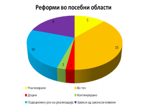 Заради следење на имплементацијата на мерките и активностите во истата Министерството за правда воспостави механизам за реализација и следење на истите во кој покрај претставници на Министерството за правда се вклучени и претставници на сите правосудни институции кои се опфатени со Стратегијата. Тие имаат задача, до Министерството за правда да доставуваат информации за прогресот на спроведувањето на активностите во нивна надлежност. На седниците на Советот, во минатата година, се разгледуваа и дискутираа бројни законски решенија. „Со оглед на фактот дека во роковите во Акцискиот план беа прилично амбициозно креирани, а потребата од сеопфатна реформа налагаше одредени законски решенија да бидат консултирани со меѓународни организации и експерти што доведе до значително одложување на реализацијата на мерките и активностите во Стратегијата, Министерството за правда изврши ревидирање на роковите во Акцискиот план на Стратегијата. Овој документ е подготвен согласно ревидираните рокови врз основа на кои ќе се имплементираат наредните мерки и активности предвидени во Стратегијата и АП. Акцискиот план на Стратегијата за реформа на правосудниот сектор е структуиран во четири поглавја ( Стратешки цели на реформата во правосудството, Стратешко планирање и креирање политики, Правосудни институции и Реформи во посебни области). Во рамките на истите поглавја се предвидени вкупно 129 мерки кои ќе се имплементираат преку реализација на 228 активности“, се вели во резимето на Извештајот.