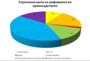 Прегледот на реализацијата по оддели во стратегијата, односно третиот дел од Извештајот започнува со стратешките цели на реформата во правосудството: